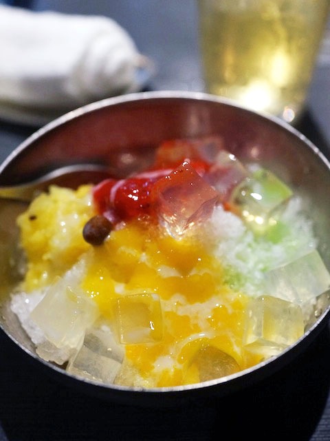 みつ豆寒天にメロンシロップ、練乳かけて味ととのえる…、マンゴー、いちごにパイナップルとどれもフレッシュの果物を凍らせたモノが置かれてて、それがシャキッと味わい鮮やか。