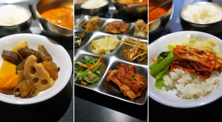 キムチは当然、キャベツのナムルや青菜にごぼうの韓国風の煮物とか茄子の煮浸し、チヂミにチャプチェと味わい、食感多彩でたのしい。