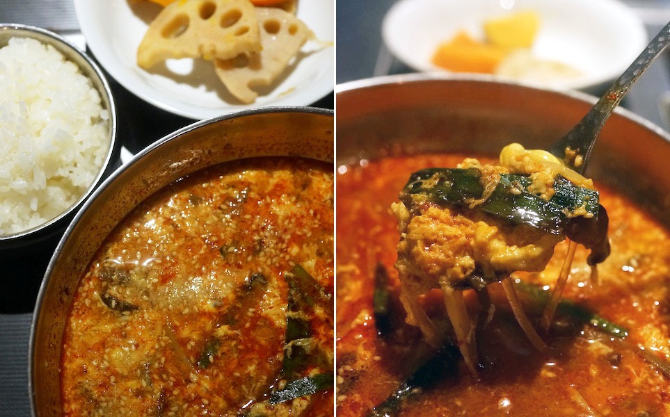 辛くて牛肉のうま味がドッシリしたスープ…、中には野菜がドッサリ入る。