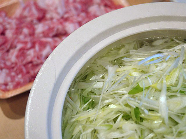 ネギがくったりなったところにしゃぶしゃぶ用の豚肉浮かべて、火を通す。