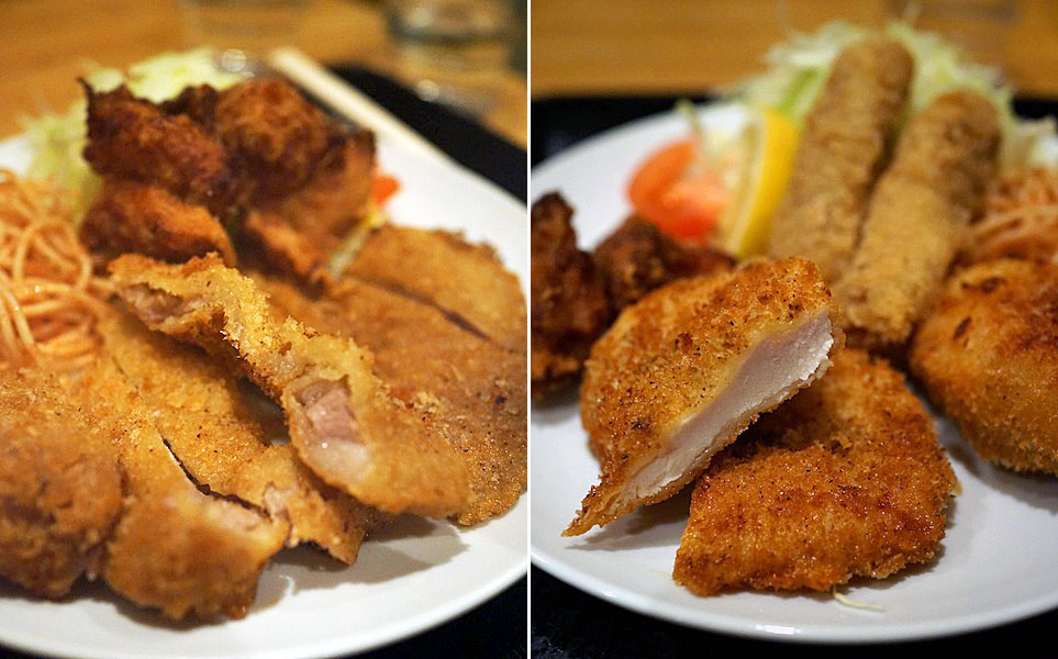 チキンカツに唐揚げ、ポテトコロッケ、ウィンナフライと盛りだくさんで特に胸肉を使ったチキンフライがムチュンと歯ごたえたのしくオキニイリ。