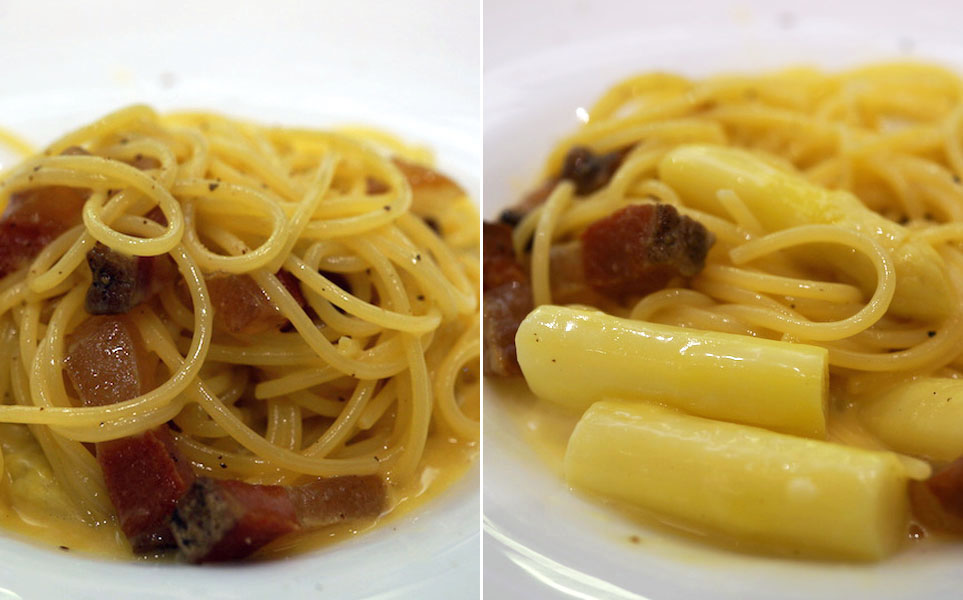 グアンチャーレとタレッジョチーズ。ベシャメルソースに生クリームで仕上げた見た目、カルボナーラではあるけれど、カルボナーラではないカルボナーラ風。
