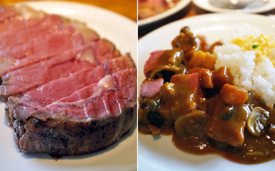 口の中を満たすシアワセとでもいいますか。ご飯をお皿の端にのっけて微塵に刻んだ茹で卵。一口大にカットした分厚い肉を並べたところにカレーをかけて、ローストビーフカレーで味わう。