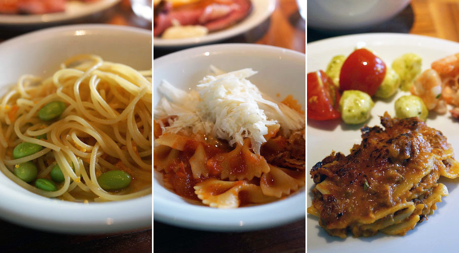スパゲッティー二をカラスミで、ショートパスタをトマトで仕上げてもらったところにチーズをたっぷり。ポッテリ味のラザニアも一緒にたのんでお腹を満たす。