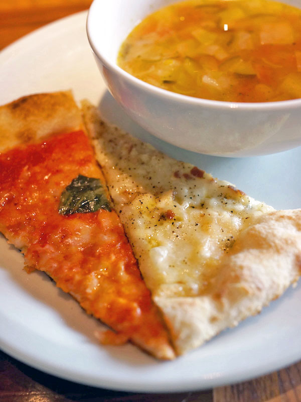 野菜がたっぷりはいったミネストローネがおいしげで、オリーブオイルをかけまわしフウフウ食べると、これがおいしい。