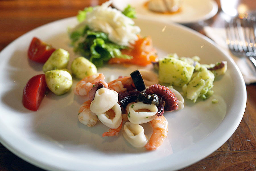 魚介類のマリネがスキッと酸味さわやか。エビのムチッとした食感が食欲さそうオゴチソウ。スモークサーモンにロメインレタスをのっけてそこにグラノパダーノチーズをたっぷり。一口ごとに食欲が湧く。