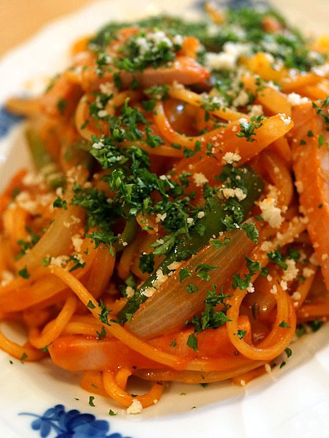 日曜の朝のスパゲティー…、冷たいパスタじゃなくってなんだか、ナポリタンを作りたくって、それで贅沢ナポリタン。