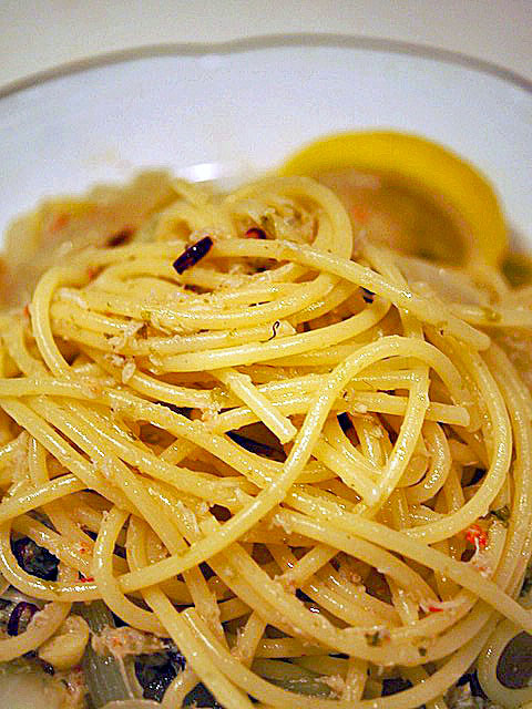 パスタが固めに茹で上がったら具材をいためた鍋にいれ、茹で汁、それからオリーブオイルを注ぎつつタプンタプンと濃度をつけて出来上がり。