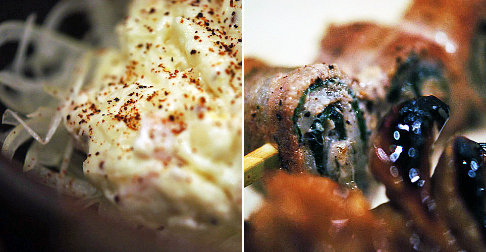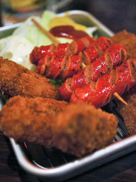 豚のロース肉で大葉をくるんだ串焼きや、ささみにホルモン、激辛ソースで食べるイカの南蛮揚げとあれこれたのんで夜のはじまり。