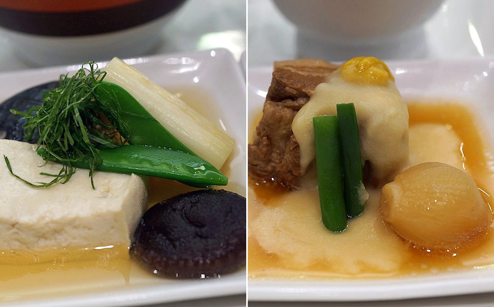 魚はタラでしっとり、ふっくら出汁と一緒に蒸し上げられて、同じ出汁にて炊かれた豆腐にネギにしいたけ、さやえんどう。