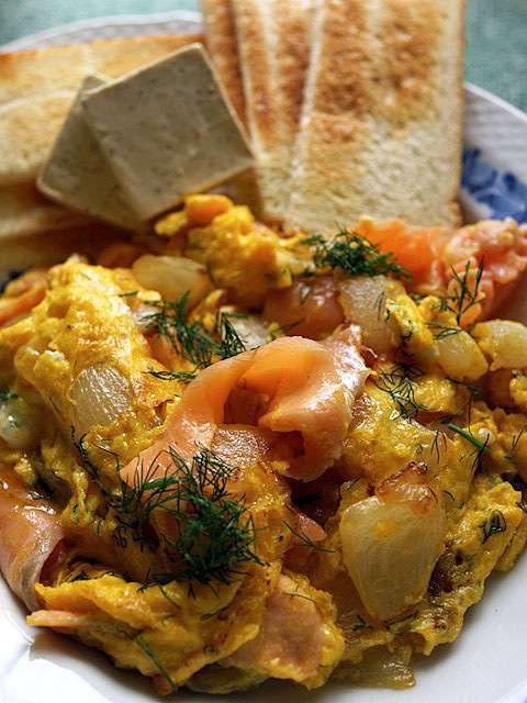 オムレツとスクランブルエッグの中間みたいな感じに仕上げて、お皿にうつし刻んだディルをぱらりと散らす。