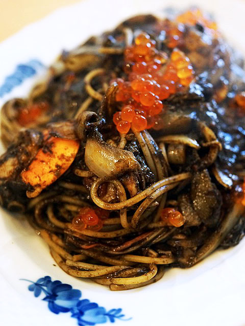 トマトの酸味とイカスミのコッテリとしたうま味のバランス抜群で、シャキシャキとした玉ねぎの歯ざわりたのしく食欲そそる。