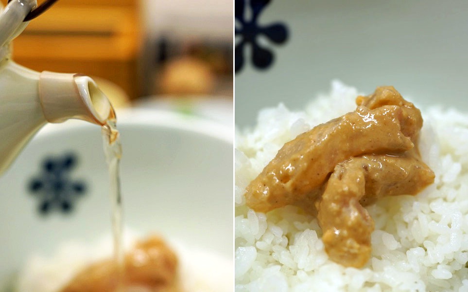 そしたら今度は鯛の上から出汁をかけ、切り身がまとった胡麻ペーストを洗い流してご飯に味を乗せて味わう…、熱い出汁で鯛の切り身がチリっと表面硬くなり、サクッと歯切れて旨みが広がる。