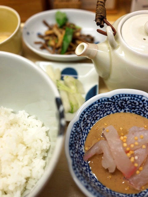 鯛の切り身にこってり胡麻をまとわせてご飯の上にのっけてパクリ。