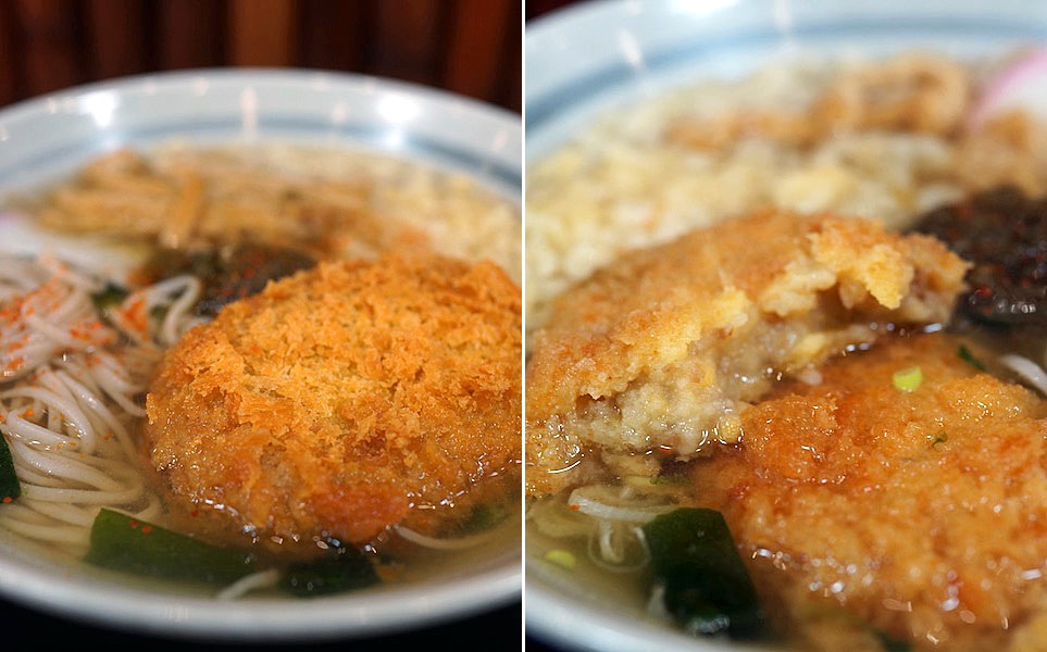けれどこれを蕎麦の上におき、スープをタップリ吸わせて食べると、ふっくらとした食感とコロッケ自体が持った塩味がスープにとけて、丼の中のすべての味がワンランクアップするようなたのしいゴチソウ。