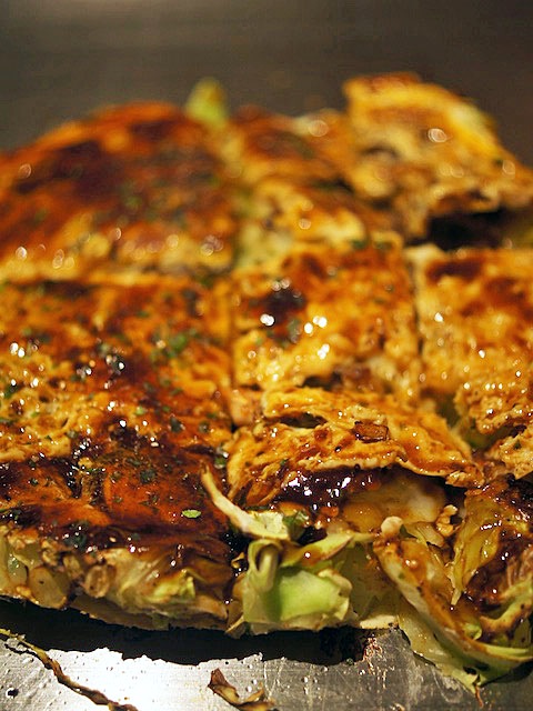 厨房でお店の人が焼いてくれたのを、テーブルごとの鉄板の上においてそれから食べるという、関西的なるスタイルの店。
