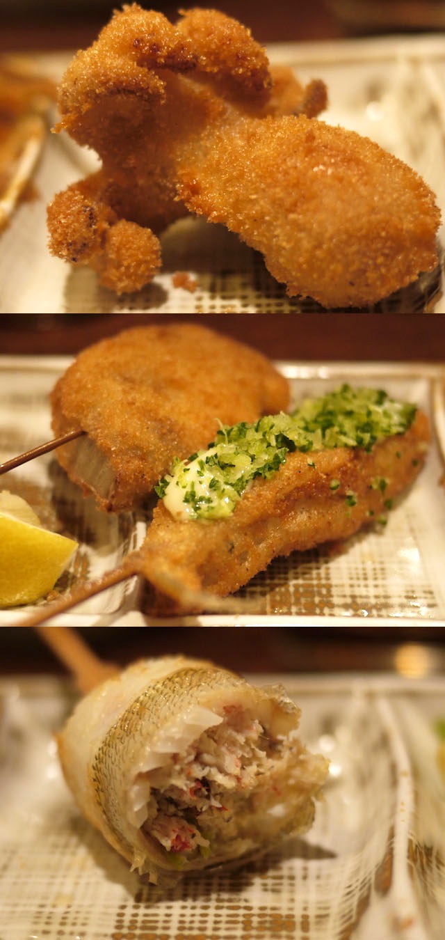 パン粉をつけぬ揚げ物もまた味わい深く、例えばキスで蟹を包んだたのしい一串。