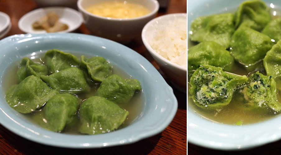 やってきたのはコロンとかわいい典型的なる水餃子。青菜を生地に練りこんで、それだけじゃなく餡にもたっぷり青菜のミンチ。風味がよくてやさしい味わい。ただ、食べてるうちに化学の力で舌がちょっと疲れてきます。