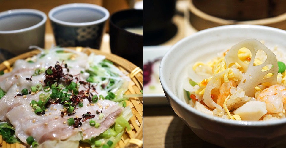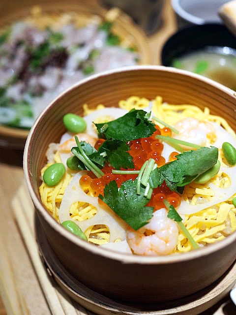 茶碗によそってハフっと味わう…、イカに小柱、エビに白身魚と具材沢山でレンコン、枝豆、錦糸卵に三つ葉にイクラ。
