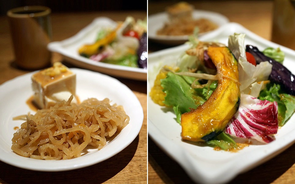 まずはランチのサービス惣菜ですと、切り干し大根と絹ごし豆腐のごまだれかけがやってきて、それに続いて野菜サラダ。