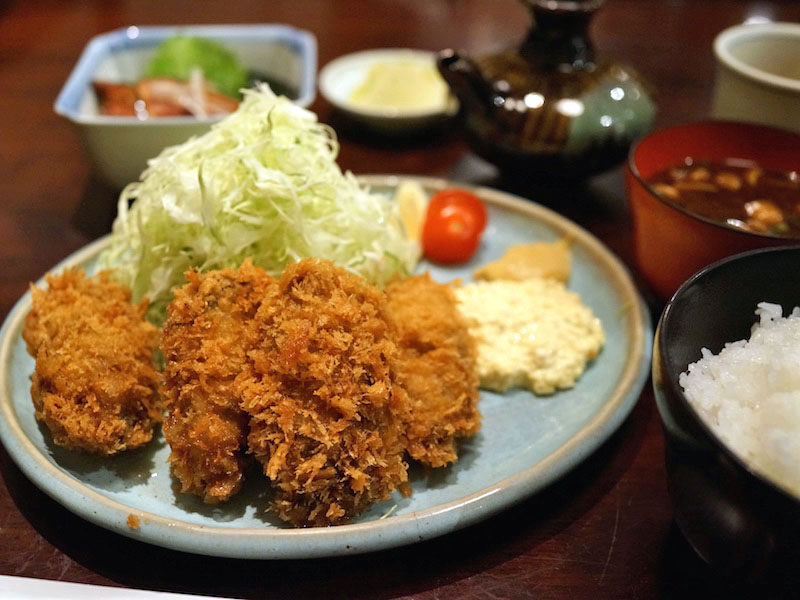 民芸調の落ち着く雰囲気。和装の女性のたおやかなサービススタイルもしっとりしていて好きなお店ではあるのだけれど、なんと表に「カキフライをはじめました」の貼り紙がある。かなり興味を惹かれてそれで今日のランチとすることにした。