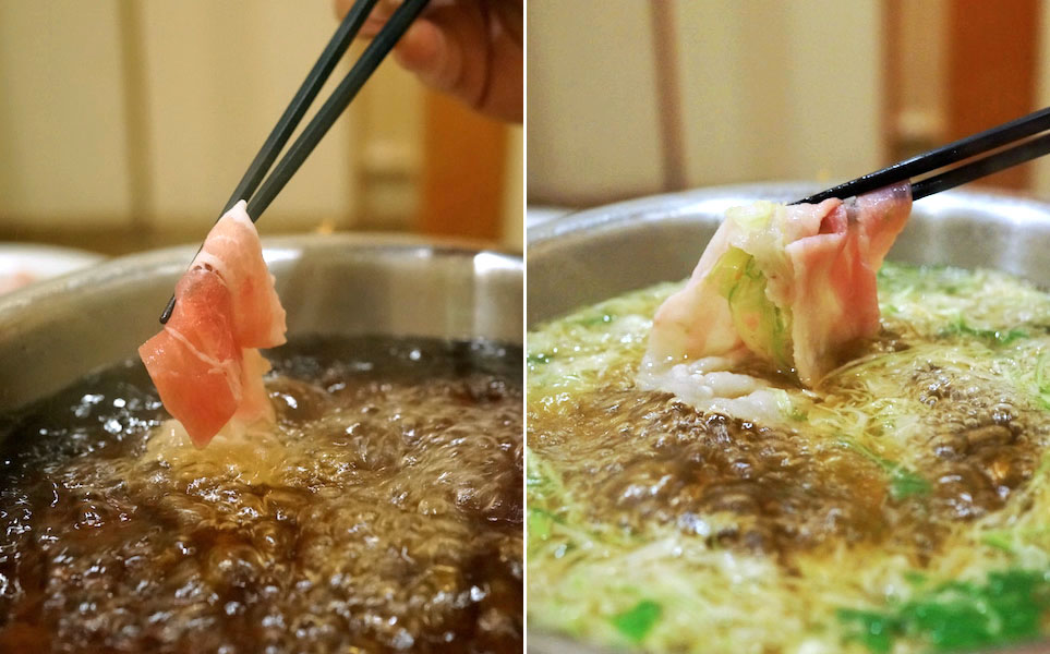 沸騰させて、そこにまずは豚肉入れてしゃぶしゃぶするとスープの風味が軽くつきそれだけ食べても十分旨い。