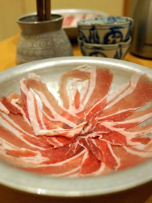 鉄のボウルにキレイに並んだ薄切り肉で、二人で来たら人数分のつまりふた鉢。その片方は脂の少ないもも肉で、もう片方には脂の乗ったばら肉ぎっしり。