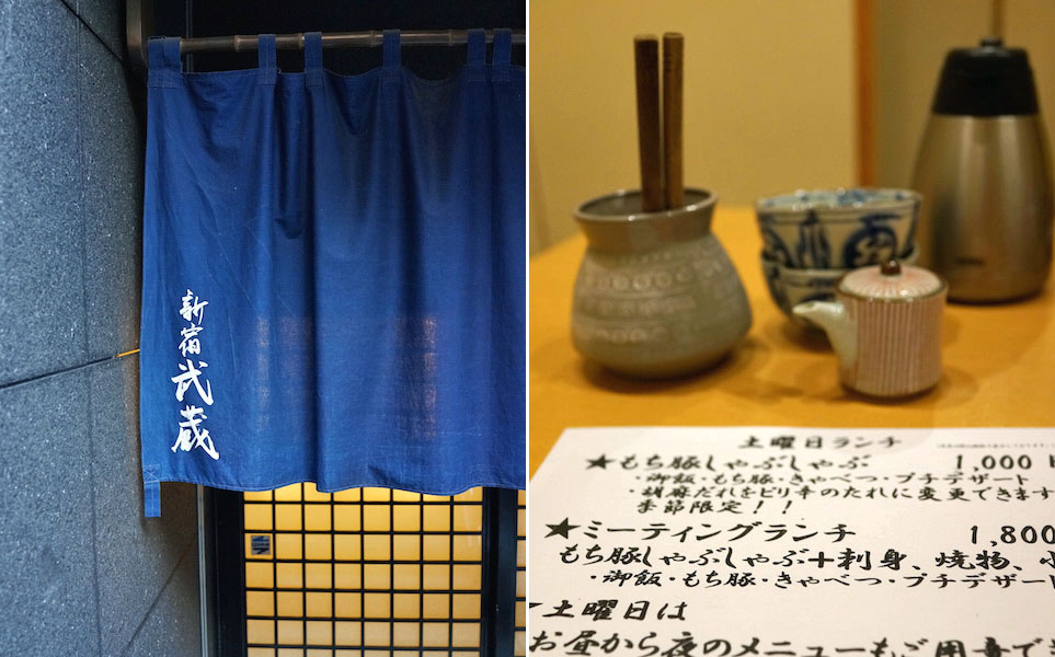 「武蔵」という豚しゃぶの専門店で、目立たぬ場所のオフィスビルの地下。ランチは手頃な値段でたのしめるという。