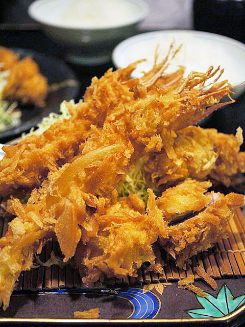 頭をそのままくっつけた大きな大正海老がまるごと…、足も頭もシッポも全部食べられてしかも頭の中のお味噌がプチュンと旨い。