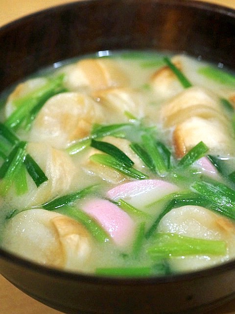 味がほどよく整ってきたら、そこにお麩をサラサラ投入…、ぷかぷか浮かんでくるのをお玉で押さえ、ゴクゴクお麩が汁を吸い込みお麩がプクッとふくらんでいく。