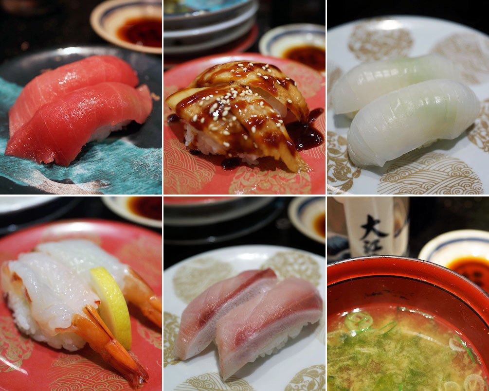 煮穴子、わさびの緑が透けて見えるほどのイカに大正海老の湯引きにブリ。