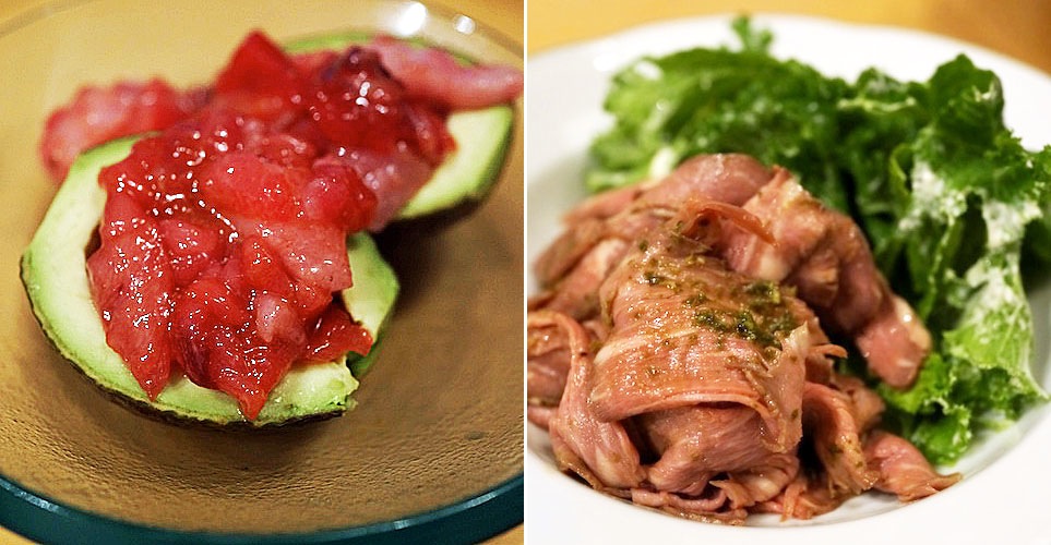おかずに料理をいくつか作る…、マグロのトロがこびりついた骨付きパーツが安くてそれを買って身だけをせせって醤油を少しのごま油、塩で味を整えアボカドと一緒に食べる。