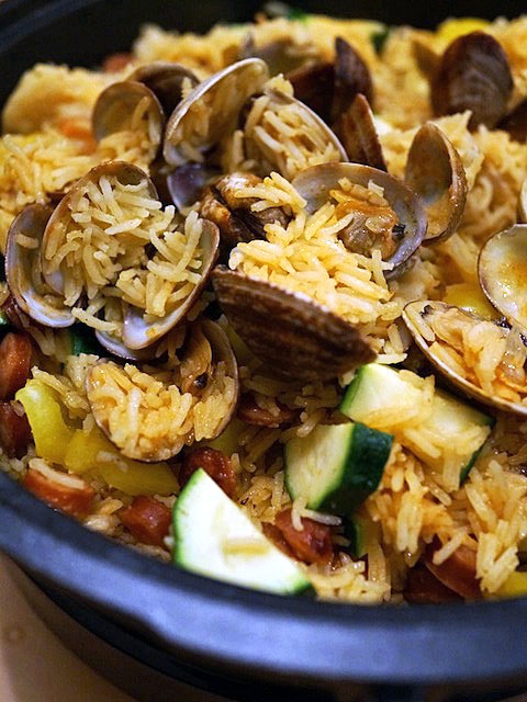サフラン風味のスープを注いでタラにチョリソをくわえて沸騰させたら他の具材。