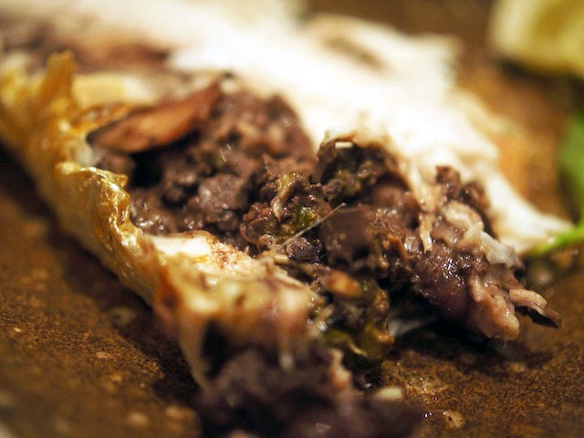 箸でさわると皮がパリッと音たてこわれ、中からフックラ、身が顔覗く。