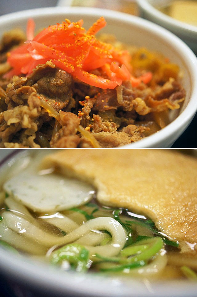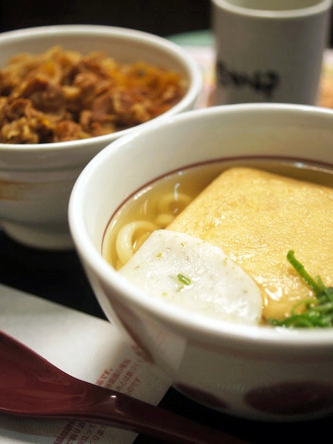 きつねうどんと和風牛丼…、どちらも小さなサイズをたのんでお腹を満たす。