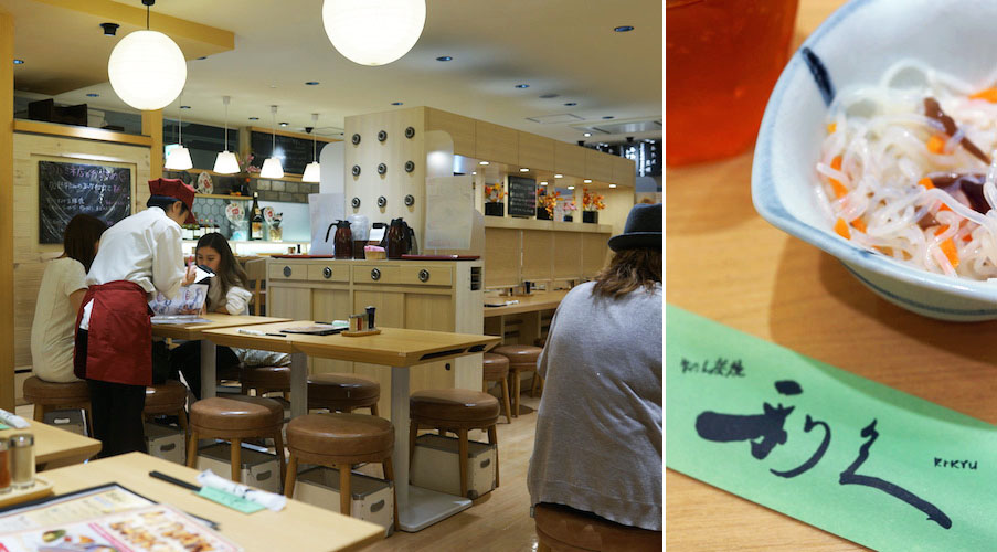 ベジカフェみたいなお店の造り。キャスケットを被ったサービススタッフに、お通しまでもが春雨サラダ。他の店では牛たんの佃煮なのに…、女流的。