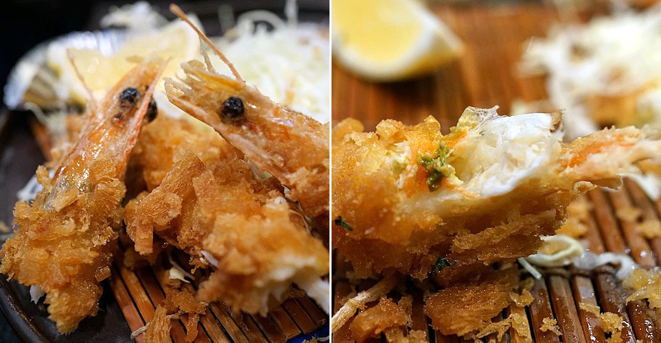 それからエビのフライがこれの一番メインの具材でしょうな…、太くて立派な車海老をスクッと伸ばして揚げたフライで、実はこれを食べに来たようなモノであります。