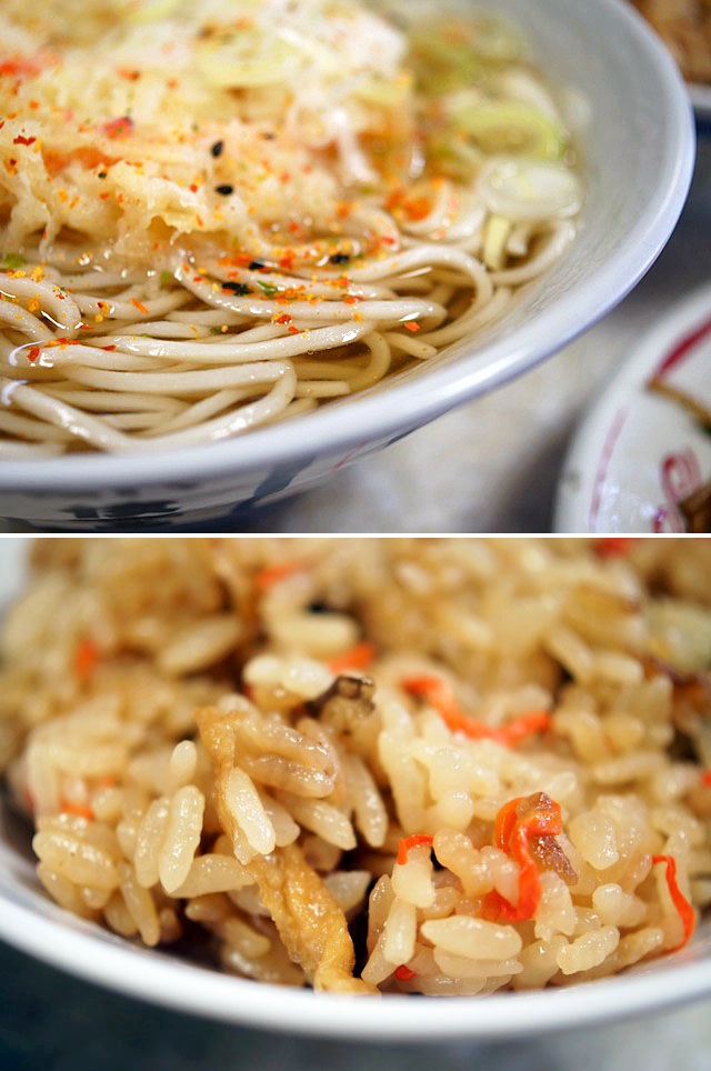 天ぷらそばにソース焼きそば、それに炊き込みご飯までもがついた定食。