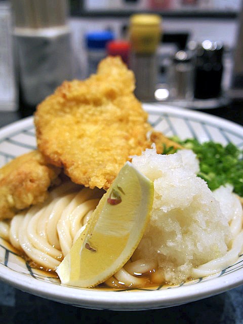 そこにタップリ、大根おろしと鶏天三枚、それからレモン。