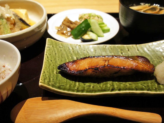 十穀米と味噌汁がつき、お膳にのっかりやってくる。