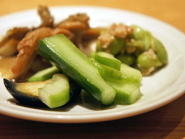キュウリと茄子と瓜を塩でシャキッと漬けたのがパリパリおいしい。