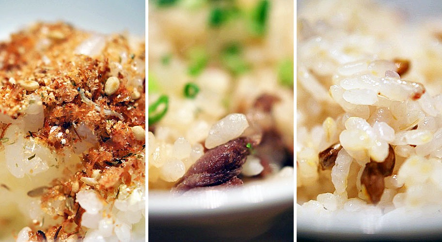 今日のご飯は三種類…、白米、十五穀米に炊き込みご飯。