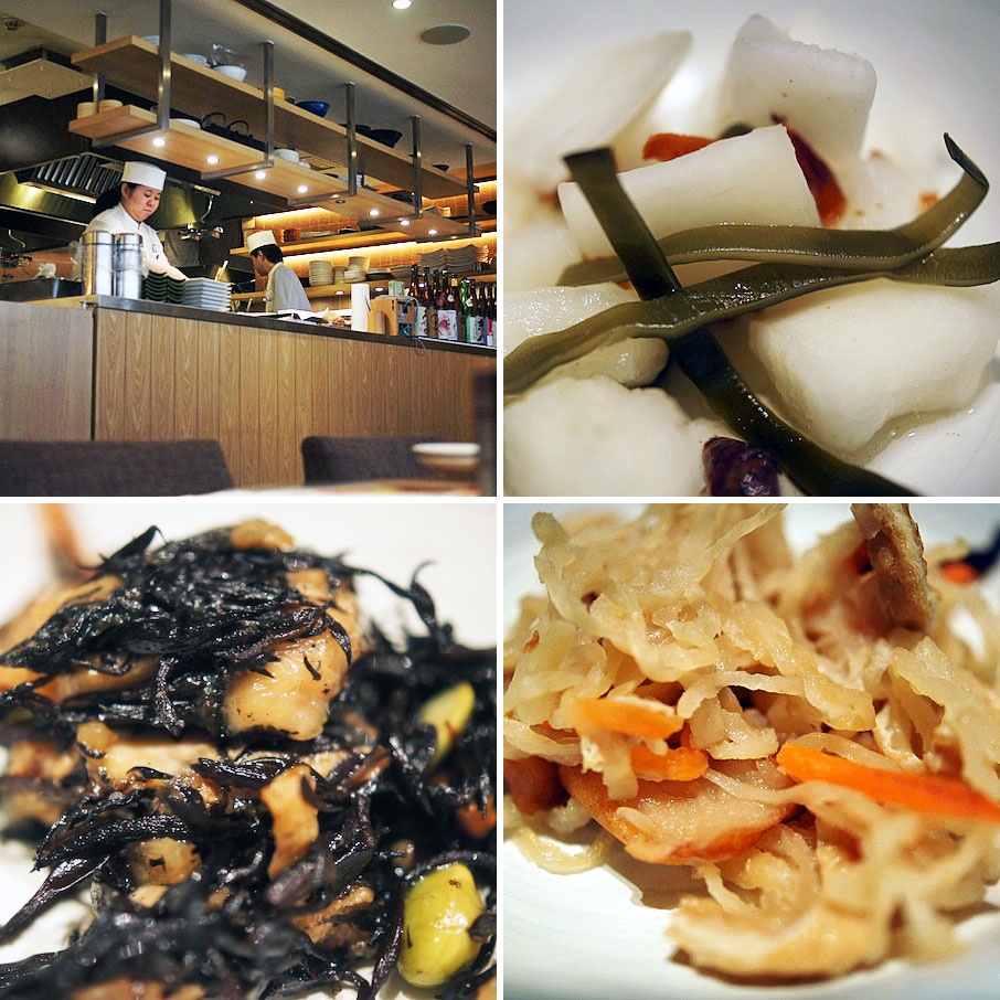 料理がやってくる前に、お茶を飲みのみおかずをつまむ。