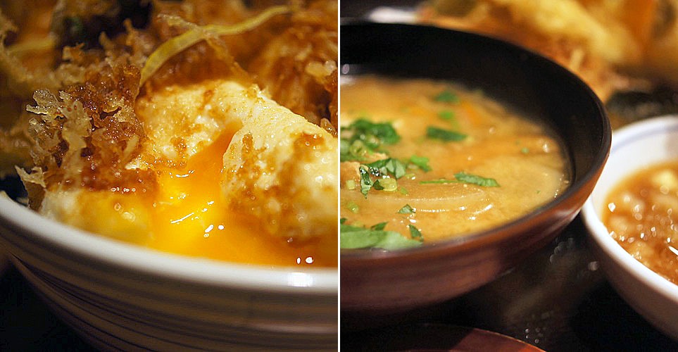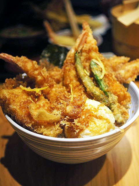 もうひとつの商品の天丼たのむと、ネタはほとんどおんなじでイカと玉子の天ぷらがのっているのがちがうとこ。