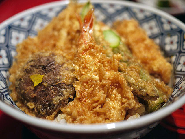 ご飯とタレと天ぷらの、この完璧なる一体感をハフハフ食べます、オゴチソウ。