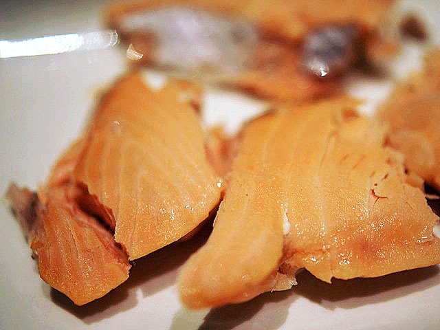 蒸気で熱を加えた鮭で、だからシットリ、余分な脂が落ちて、食感、風味もやわらかい。
