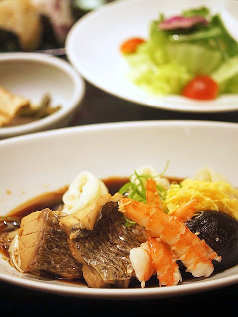 鯛の煮汁に昆布の出汁で作った煮汁をキリッとさまし、それをタップリ装って、よぉく混ぜて召し上がれって言葉のとおりよくまぜる。