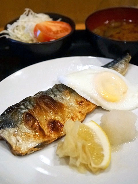 こんがり焼けたサバ塩焼きに、よく焼き目玉焼きが添えられご飯と味噌汁、サラダに漬物という定食がくる。