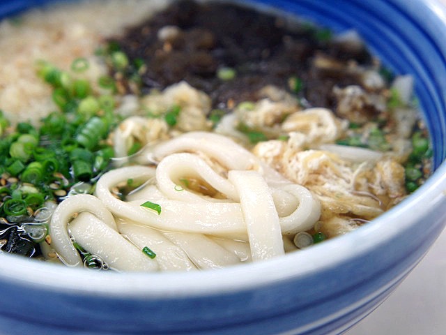 関西風の温かいうどんの上にシソ、梅干、鰹節、ねぎ、