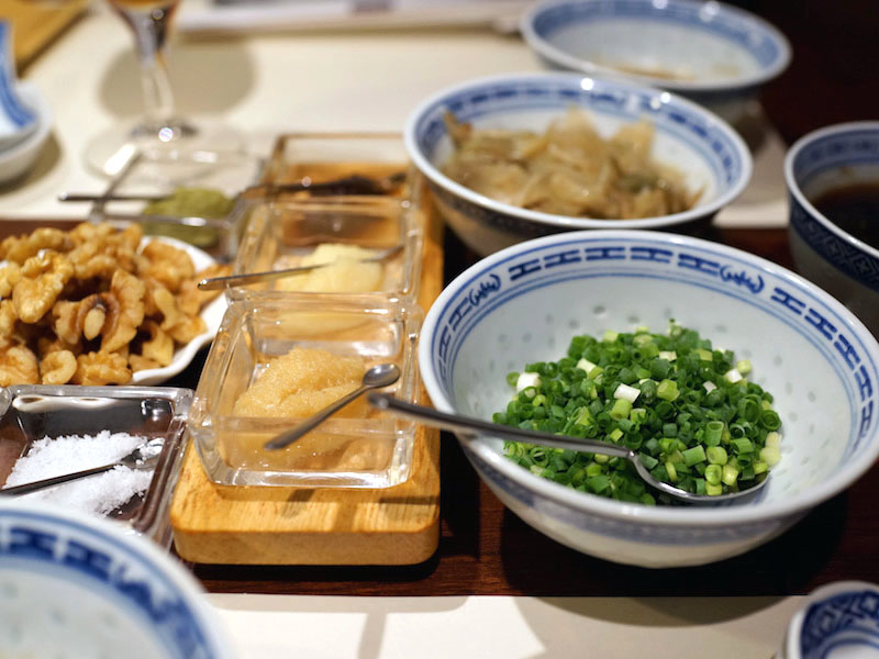 刻んだネギにおろしたニンニク、すり生姜。自家製の中華スパイスで作った辛子味噌に塩に柚子胡椒。